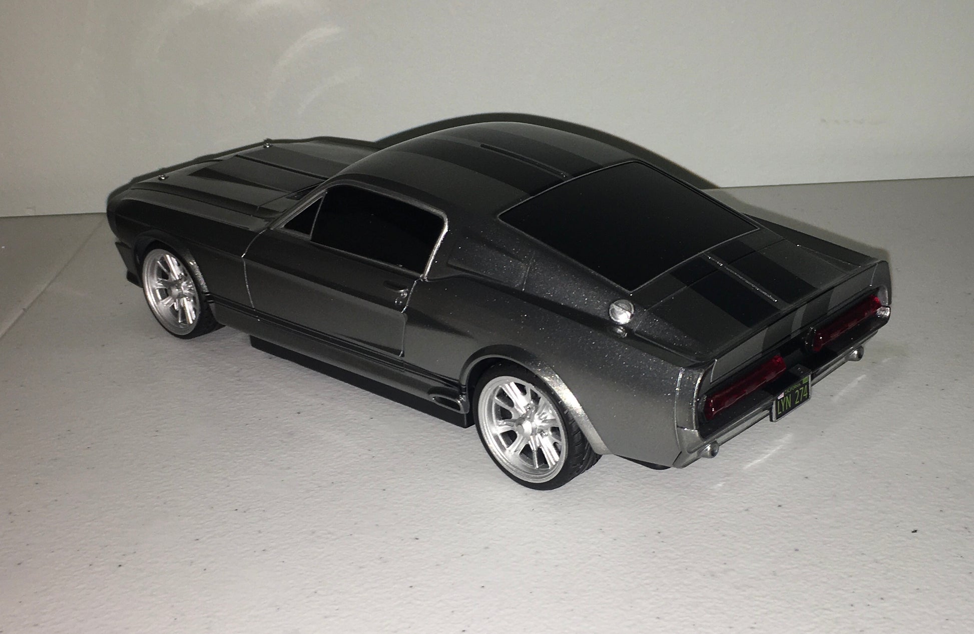 Greenlight R/C 1/18 scale Gone in 60 Seconds Custom 1967 Ford Mustang GT500 "Eleanor" remote controlled toy car. The car requires 6 AA batteries and is 2.4 GHz